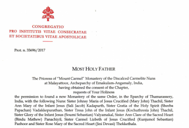 The Congregation for Institutes of Consecrated Life and Societies of Apostolic Life, having seen the favourable vote of the Ordinary of the Monastery and the Bishop of Thamarassery, grants the request to found a new monastery in the Eparchy of Thamarasssery.