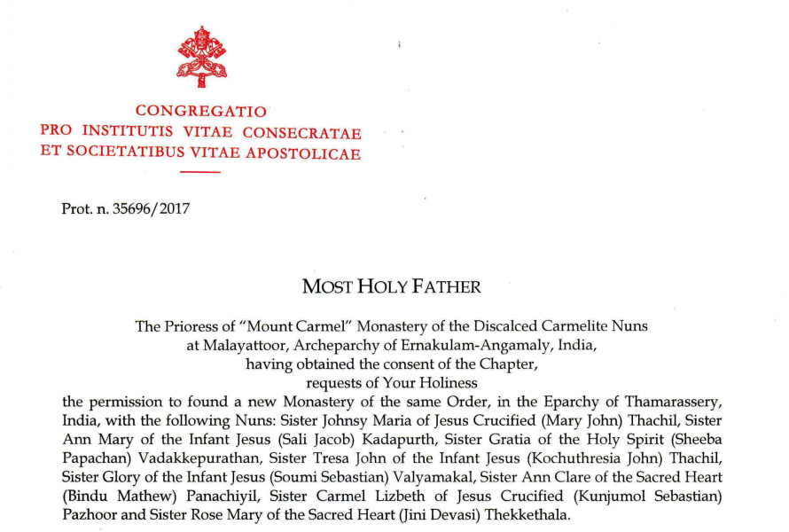 The Congregation for Institutes of Consecrated Life and Societies of Apostolic Life, having seen the favourable vote of the Ordinary of the Monastery...